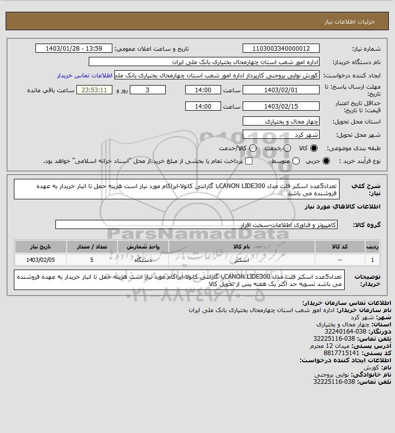شرح کلی نیاز: تعداد5عدد اسکنر فلت مدل CANON LIDE300با گارانتی کانولا-ایراکام مورد نیاز است هزینه حمل تا انبار خریدار به عهده فروشنده می باشد
