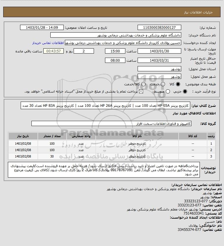 شرح کلی نیاز: کارتریج پرینتر HP 05A تعداد 100 عدد | کارتریج پرینتر HP 26A تعداد 100 عدد | کارتریج پرینتر HP 83A تعداد 30 عدد