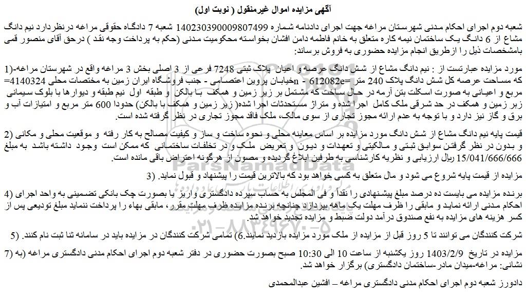 شعبه دوم اجرای احکام مدنی شهرستان مراغه جهت اجرای دادنامه شماره 140230390009807499 شعبه 7 دادگاه حقوقی مراغه درنظردارد نیم دانگ مشاع از 6 دانگ یک ساختمان نیمه کاره متعلق به خانم فاطمه دامن افشان بخواسته محکومیت مدنی (حکم به پرداخت وجه نقد ) درحق آقای منصور قمی بامشخصات ذیل را ازطریق انجام مزایده حضوری به فروش برساند: