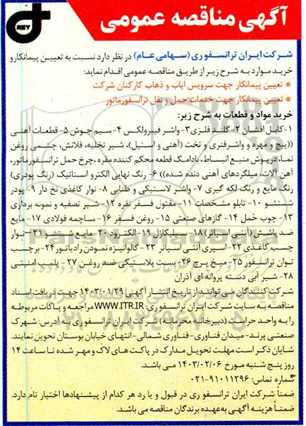 شرکت ایران ترانسفو ری (سهامی عام ) در نظر دارد نسبت به تعیین پیمانکار و خرید موارد به شرح زیر از طریق مناقصه عمومی اقدام نماید: