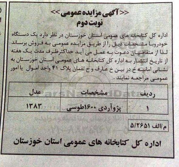 اداره کل کتابخانه های عمومی استان خوزستان در نظر دارد یک دستگاه خودرو با مشخصات ذیل را از طریق مزایده عمومی به فروش برساند لذا از متقاضیان دعوت به عمل می آید حداکثر ظرف مدت یک هفته از تاریخ انتشار به اداره کل کتابخانه های عمومی استان خوزستان به نشانی امانیه خ دزبین خ عارف و خ لقمان پلاک 41 واحد اموال یا امور عمومی مراجعه نمایند