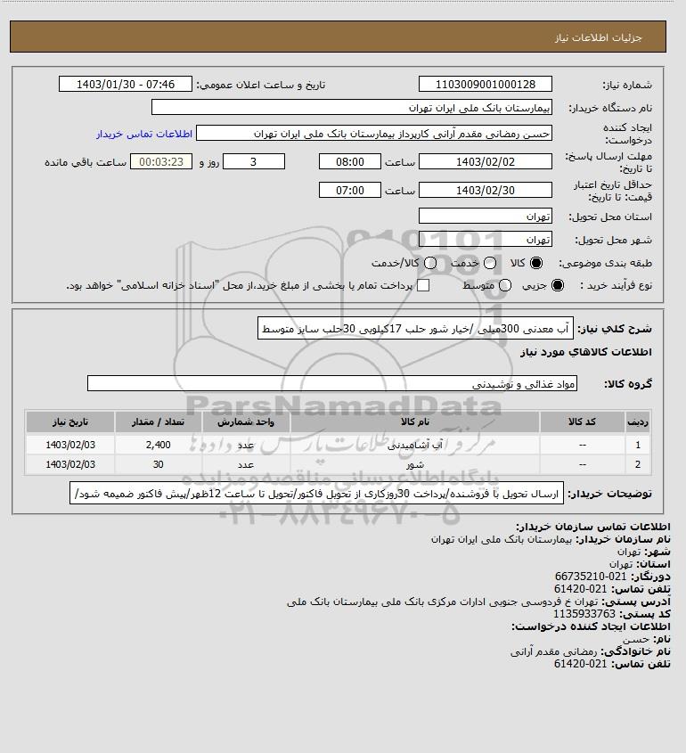 نام سازمان خریدار: بیمارستان بانک ملی ایران تهران