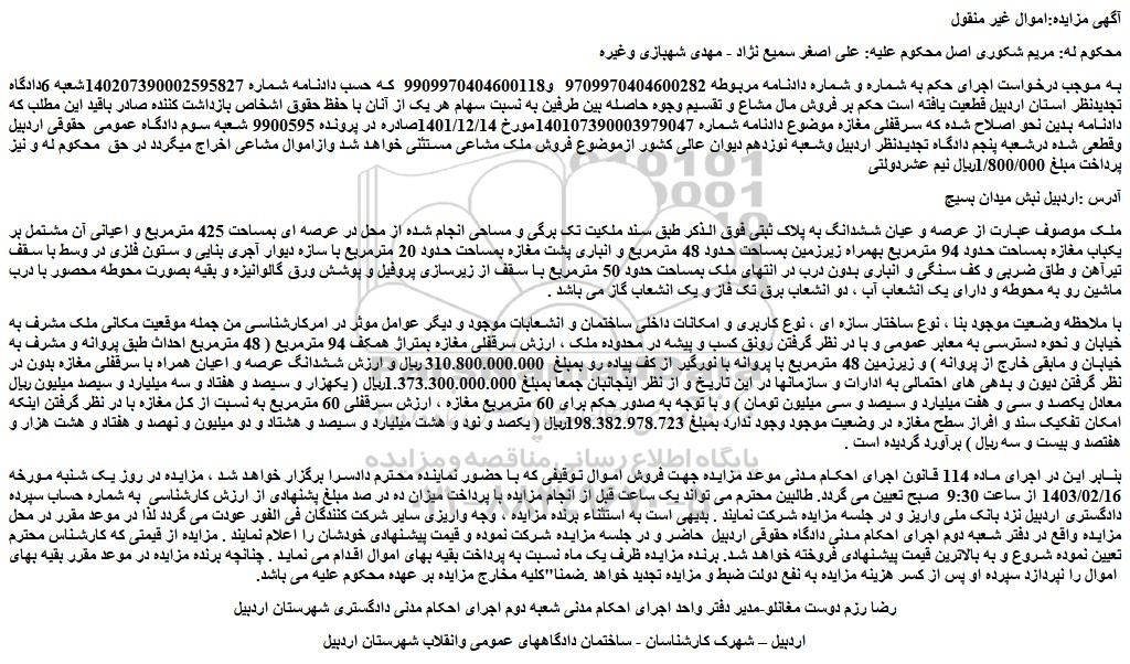 به موجب درخواست اجرای حکم به شماره و شماره دادنامه مربوطه 9709970404600282 و9909970404600118 که حسب دادنامه شماره 140207390002595827شعبه 6دادگاه تجدیدنظر استان اردبیل قطعیت یافته است حکم بر فروش مال مشاع و تقسیم وجوه حاصله بین طرفین به نسبت سهام هر یک از آنان با حفظ حقوق اشخاص بازداشت کننده صادر باقید این مطلب که دادنامه بدین نحو اصلاح شده که سرقفلی مغازه موضوع دادنامه شماره 140107390003979047مورخ 1401/12/14صادره در پرونده 9900595 شعبه سوم دادگاه عمومی حقوقی اردبیل وقطعی شده درشعبه پنجم دادگاه تجدیدنظر اردبیل وشعبه نوزدهم دیوان عالی کشور ازموضوع فروش ملک مشاعی مستثنی خواهد شد وازاموال مشاعی اخراج میگردد در حق محکوم له و نیز پرداخت مبلغ 1/800/000ریال نیم عشردولتی