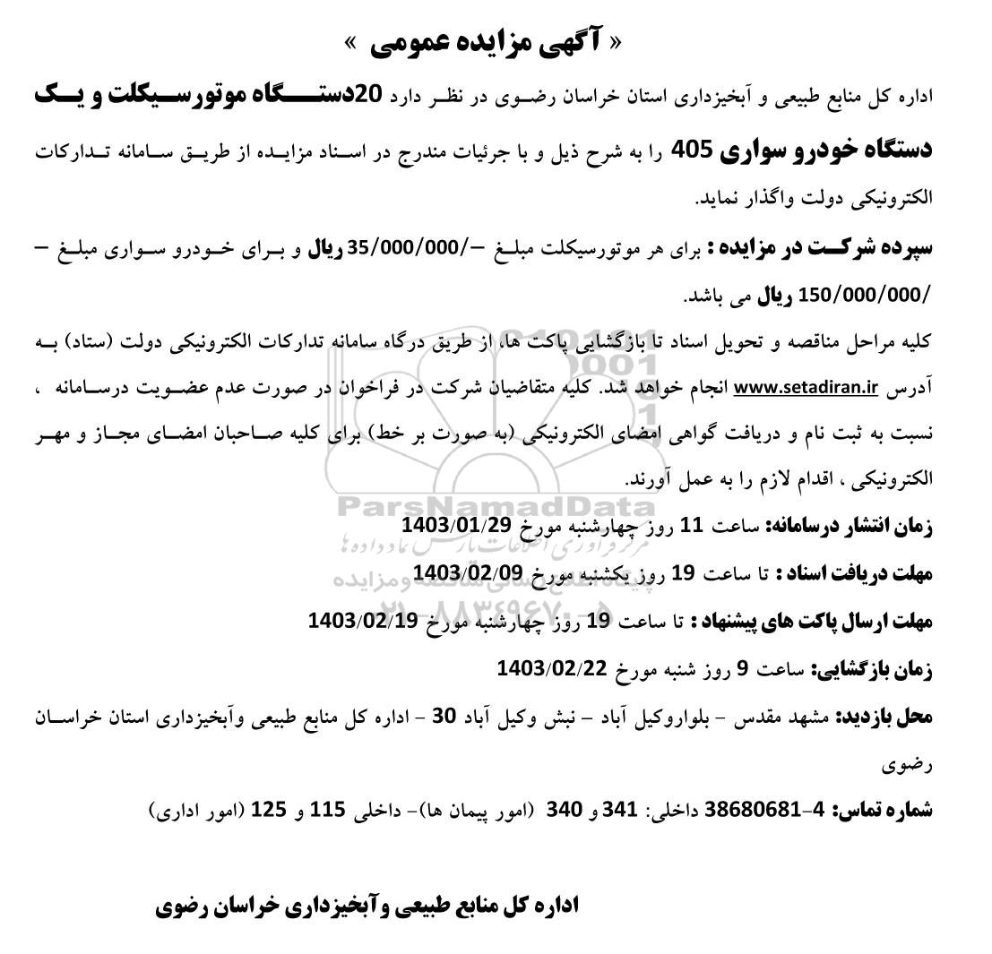 اداره کل منابع طبیعی و آبخیزداری استان خراسان رضوی در نظر دارد 20 دستگاه موتورسیکلت و یک دستگاه خودرو سواری 405 را به شرح ذیل و با جرئیات مندرج در اسناد مزایده از طریق سامانه تدارکات