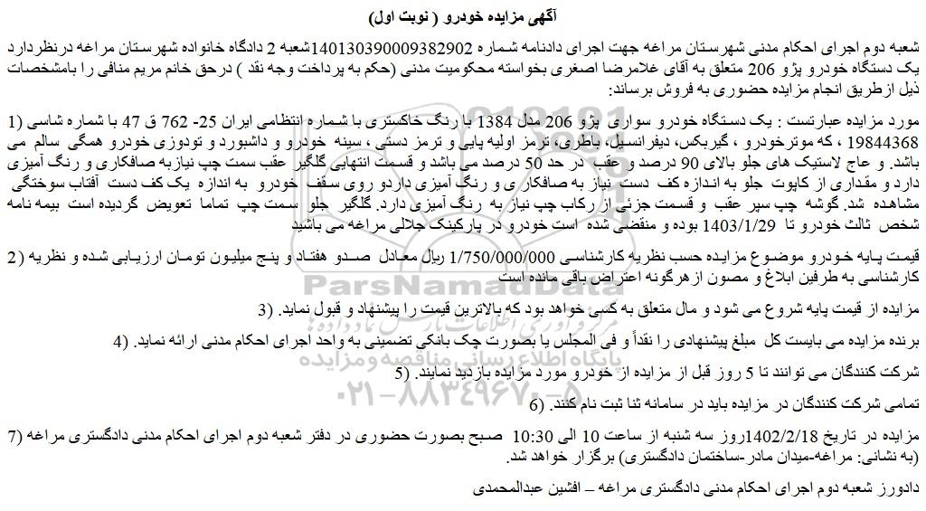 شعبه دوم اجرای احکام مدنی شهرستان مراغه جهت اجرای دادنامه شماره 140130390009382902شعبه 2 دادگاه خانواده شهرستان مراغه درنظردارد یک دستگاه خودرو پژو 206 متعلق به آقای غلامرضا اصغری بخواسته محکومیت مدنی (حکم به پرداخت وجه نقد ) درحق خانم مریم منافی را بامشخصات ذیل ازطریق انجام مزایده حضوری به فروش برساند: