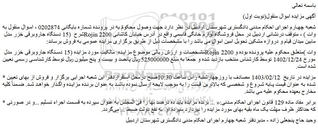 شعبه چهارم اجرای احکام مدنی دادگستری شهرستان اردبیل در نظر دارد جهت وصول محکومٌ به در پرونده شماره بایگانی 0202874 ، اموال منقول به شرح  (15 دستگاه جاروبرقی خزر مدل Rojin 2200 وات ) ، متوقف درنشانی اردبیل در محل فروشگاه لوازم خانگی قاسمی واقع در آدرس خیابان کاشانی مابین میدان قیام و دروازه مشکین تحویل امین اموال می باشد را با مشخصات ذیل از طریق برگزاری مزایده عمومی به فروش برساند: