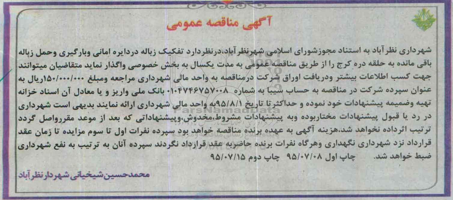 شهرداری نظرآباد به استناد مجوز شورای اسلامی شهر نظر آباد در نظر دارد تفکیک زباله در دایره امانی و بارگیری و حمل زباله باقی مانده به حلقه دره کرج را از طریق مناقصه عمومی به مدت یکسال به بخش خصوصی واگذار نماید. متقاضیان جهت کسب اطلاعات بیشتر و دریافت اوراق شرکت در مناقصه به واحد مالی شهرداری مراجعه و مبلغ 150.000.000 ریال به عنوان سپرده شرکت در مناقصه به حساب سیبا به شماره 0104746757008 بانک ملی واریز و یا معادل آن اسناد خزانه تهیه و ضمیمه پیشنهادات خود نموده و حداکثر تا تاریخ 95.08.01 به واحد مالی شهرداری ارائه نمایند. بدیهی است شهرداری در رد یا قبول هر یک از پیشنهادات مختار بوده و به پیشنهادات مشروط، مخدوش، و پیشنهاداتی که بعد از موعدمقرر واصل گردد ترتیب اثر نخواهد شد هزینه آگهی به عهده برنده مناقصه خواهد بود سپرده نفرات اول تا سوم مزایده تا زمان عقد قرارداد نزد شهرداری نگهداری و هرگاه نفرات برنده حاضر به عقد قرارداد نگردند سپرده آنان به ترتیب به نفع شهرداری ضبط خواهد شد