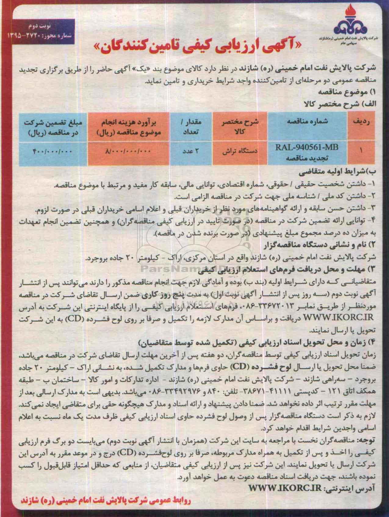 تجدید مناقصه دستگاه تراش - نوبت دوم, آگهی ارزیابی کیفی تامین کنندگان، تجدید مناقصه دستگاه تراش -نوبت دوم