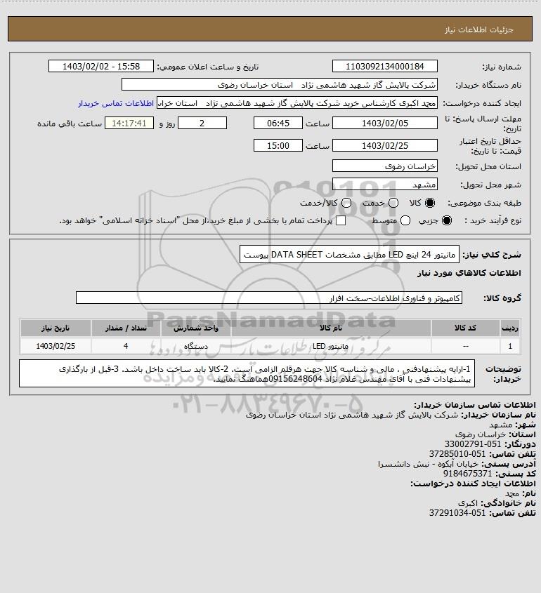 | 1 | -- | مانیتور LED | دستگاه | 4 | 1403/02/25 |