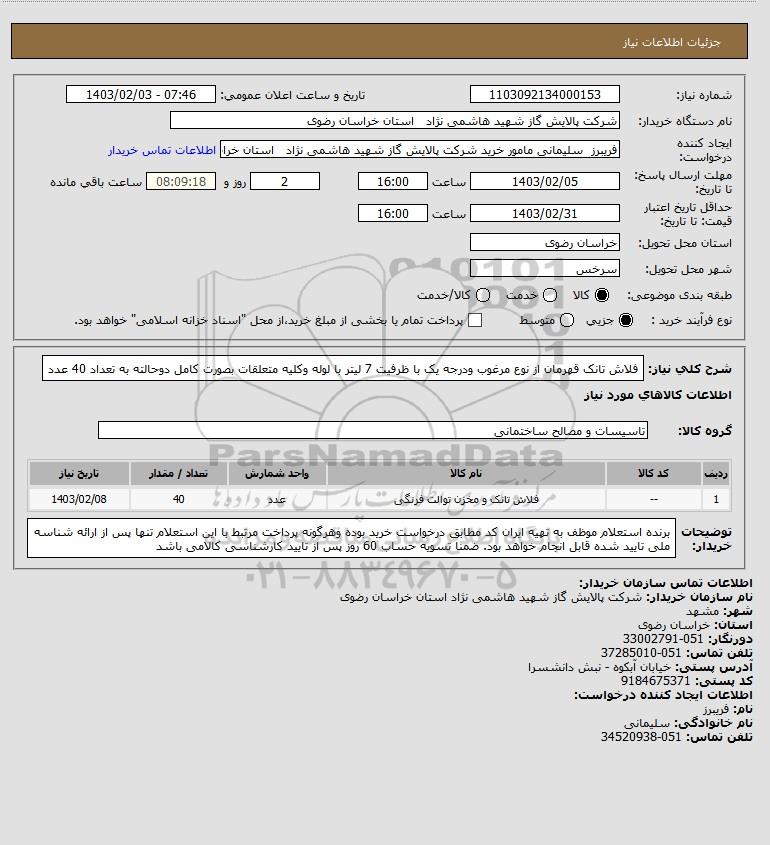 نام دستگاه خریدار:شرکت پالایش گاز شهید هاشمی نژاد استان خراسان رضوی