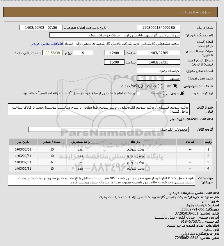 نام دستگاه خریدار:شرکت پالایش گاز شهید هاشمی نژاد استان خراسان رضوی