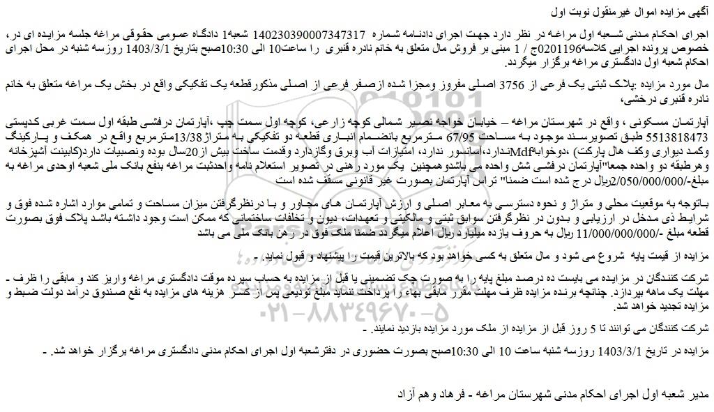 مال مورد مزایده :پلاک ثبتی یک فرعی از 3756 اصلی مفروز ومجزا شده ازصفر فرعی از اصلی مذکورقطعه یک تفکیکی واقع در بخش یک مراغه متعلق به خانم نادره قنبری درخشی،