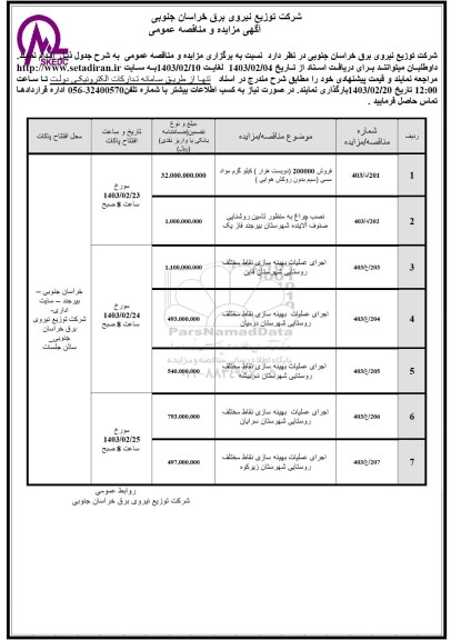 شرکت توزیع نیروی برق خراسان جنوبی در نظر دارد نسبت به برگزاری مزایده و مناقصه عمومی به شرح جدول ذیل اقدام نمایید.