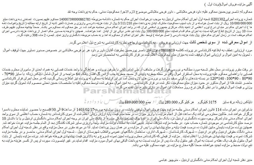 بنابراین در اجرای ماده 114 قانون اجرای احکام مدنی جلسه مزایده جهت فروش اموال توقیفی یادشده در روز دوشنبه مورخه1403/02/17 از ساعت9 الی 9/30صبح با حضور نماینده محترم دادسرا برگزار خواهد شد. طالبین محترم می توانند یک ساعت قبل از انجام مزایده با واریز میزان ده در صد مبلغ قیمت پایه ارزش ریالی اعلام شده از سوی کارشناس به شماره حساب اعلامی از سوی واحد اجرای احکام مدنی بنام تمرکز وجوه سپرده دادگستری اردبیل نزد بانک ملی ایران یا اخذ چک تضمین بانکی صرفاً از بانک ملی ایران در وجه اجرای احکام مدنی دادگستری اردبیل و یا با داشتن 10 درصد مبلغ کارشناسی در موجودی شماره حساب خود در جلسه مزایده شرکت نمایند. بدیهی است به استثناء برنده مزایده، وجه واریزی سایر شرکت کنندگان بعد از اتمام جلسه مزایده عودت خواهد شد. همچنین برنده مزایده بایستی مابین تفاوت ده درصد قیمت پایه و مبلغ پیشنهادی را پس از مزایده و در همان روز پرداخت نماید. لذا در موعد مقرر در محل مزایده واقع در دفتر شعبه اول اجرای احکام مدنی دادگاه حقوقی اردبیل واقع در اردبیل – شهرک کارشناسان - شهرک اداری- ساختمان دادگاههای عمومی وانقلاب شهرستان اردبیل - شعبه اول اجرای احکام مدنی، حاضر و در جلسه مزایده شرکت نموده و قیمت پیشنهادی خودشان را اعلام نمایند . مزایده از قیمتی که کارشناس محترم پرونده تعیین نموده شروع و به بالاترین قیمت پیشنهادی فروخته خواهد شد. برنده مزایده بایستی از بابت اموال منقول ظرف یک هفته و نسبت به اموال غیر منقول یک ماه پس از مزایده نسبت به پرداخت الباقی بهای اموال مورد مزایده اقدام نماید.در غیر اینصورت، سپرده او پس از کسر هزینه مزایده به نفع دولت ضبط و مزایده تجدید خواهدشد ضمنا کلیه مخارج مزایده بر عهده محکوم علیه می باشد.