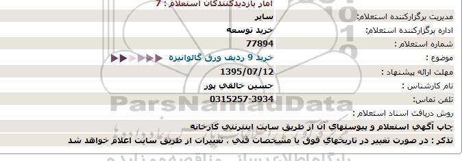 استعلام خرید 9 ردیف ورق گالوانیزه , استعلام خرید 9 ردیف ورق گالوانیزه