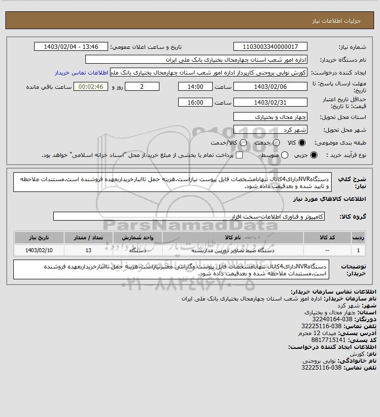 نام دستگاه خریدار:اداره امور شعب استان چهارمحال بختیاری بانک ملی ایران