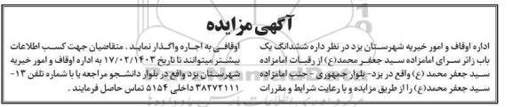 اداره اوقاف و امور خیریه شهرستان یزد در نظر دارد ششدانگ یک باب زائرسرای امامزاده سید جعفر محمد (ع) از رقبات امامزاده سید جعفر محمد (ع) واقع در یزد - بلوار جمهوری - جنب امامزاده سیدجعفر محمد (ع) را از طریق مزایده و با رعایت شرایط و مقررات اوقافی به اجاره واگذار نماید.