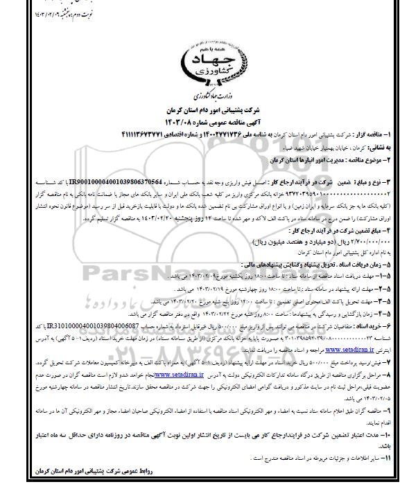2.700.000.000 ریال (دو میلیارد و هفتصد میلیون ریال) به نام اداره کل پشتیبانی امور دام استان کرمان
