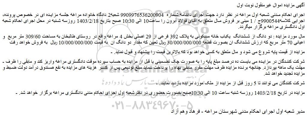 - مزایده در تاریخ 1403/2/18 روزسه شنبه ساعت 10 الی 10:30صبح بصورت حضوری در دفترشعبه اول اجرای احکام مدنی دادگستری مراغه برگزار خواهد شد.