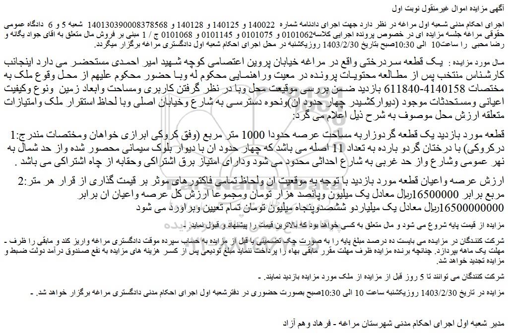 - مزایده در تاریخ 1403/2/30 روزیکشنبه ساعت 10 الی 10:30صبح بصورت حضوری در دفترشعبه اول اجرای احکام مدنی دادگستری مراغه برگزار خواهد شد.