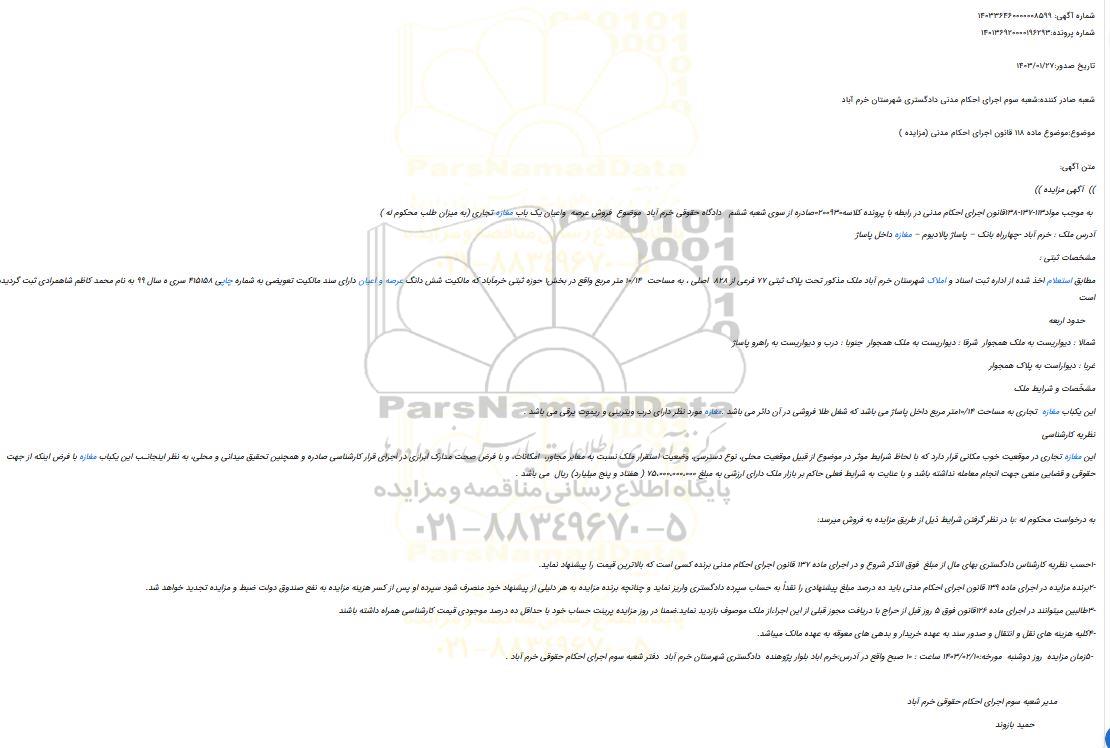 شعبه صادر کننده:شعبه سوم اجرای احکام مدنی دادگستری شهرستان خرم آباد