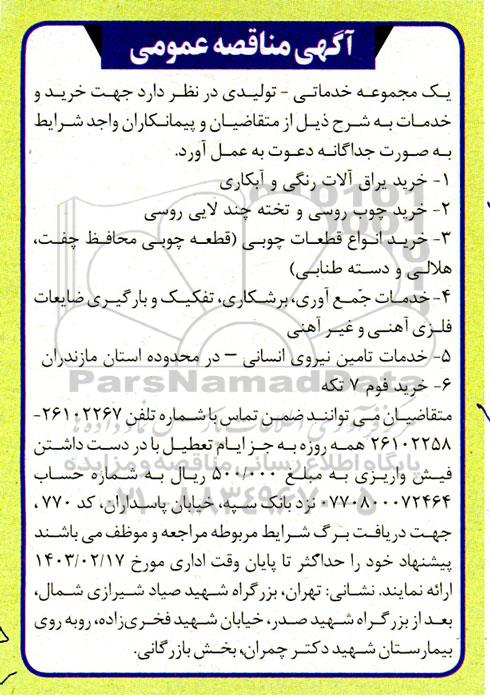 یک مجموعه خدماتی - تولیدی در نظر دارد جهت خرید و خدمات به شرح ذیل از متقاضیان و پیمانکاران واجد شرایط به صورت جداگانه دعوت به عمل آورد.