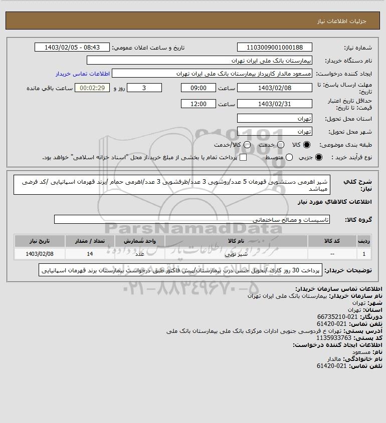 نام دستگاه خریدار:بیمارستان بانک ملی ایران تهران