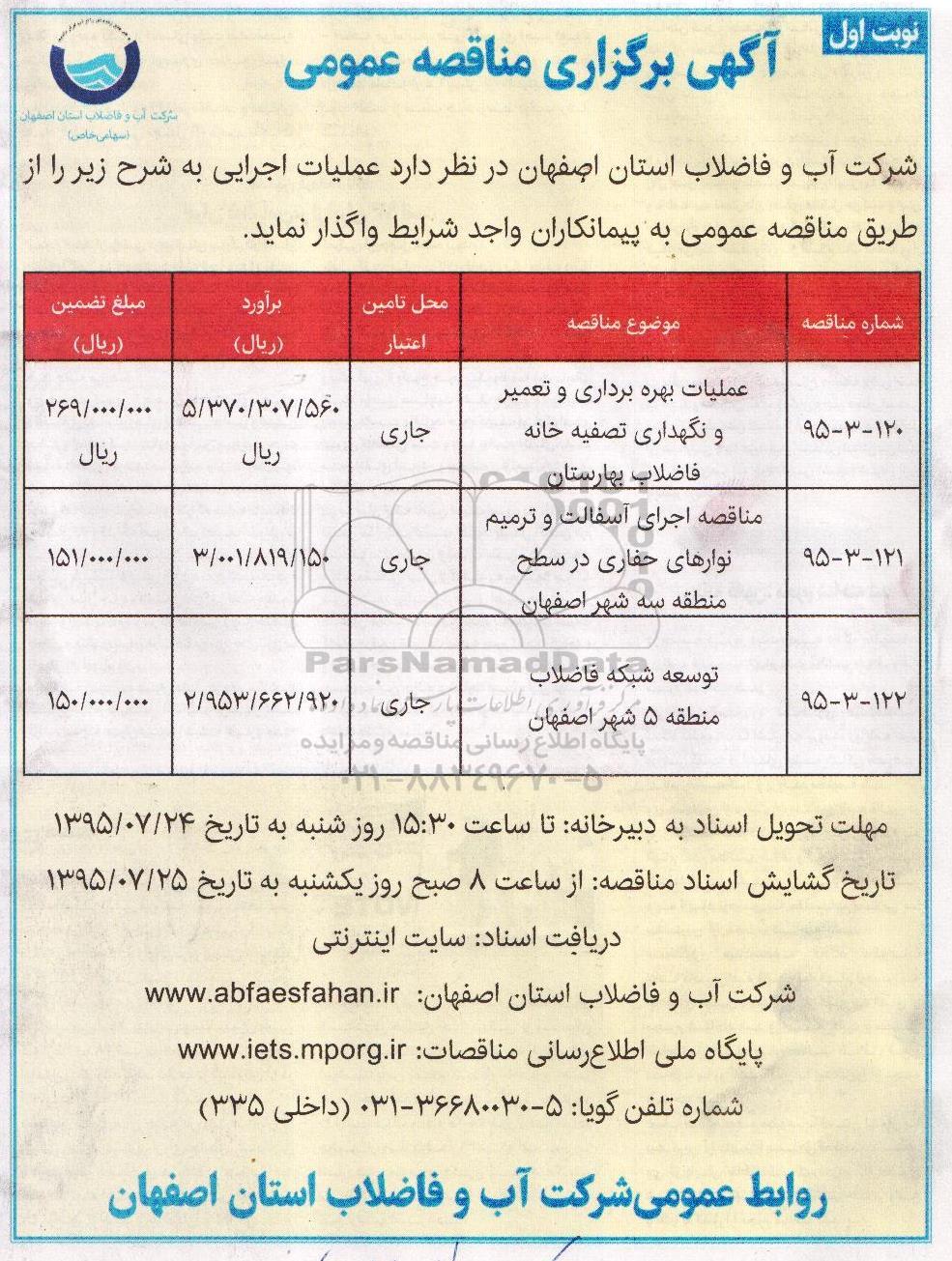 شرکت آب و فاضلاب استان اصفهان در نظر دارد عملیات اجرایی به شرح زیر را از طریق مناقصه عمومی به پیمانکاران واجد شرایط واگذار نماید