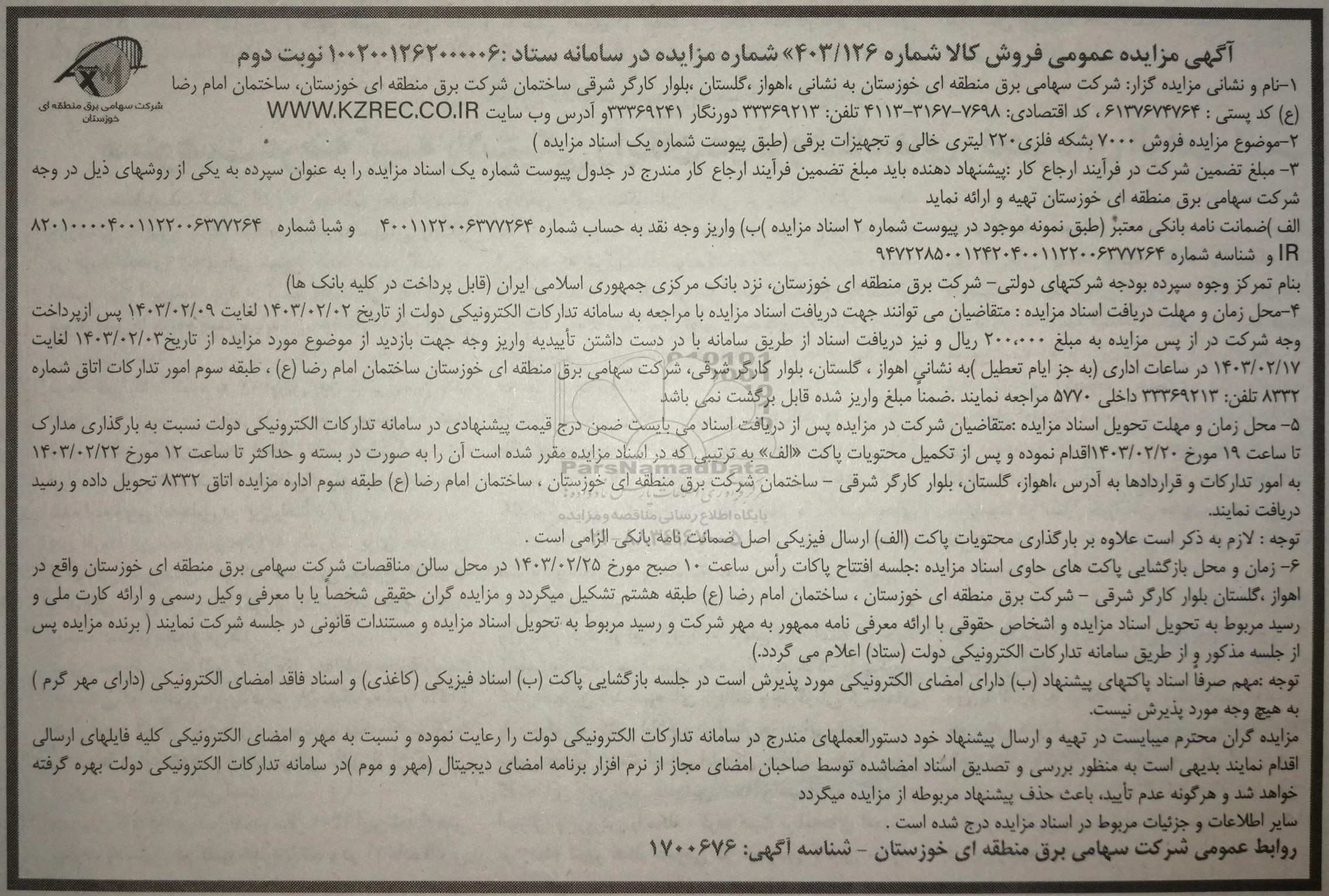 آگهی مزایده عمومی فروش کالا شماره 403/126؟