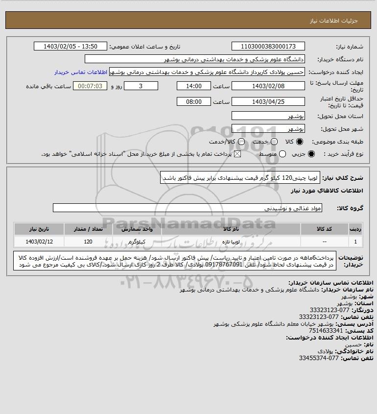 | 1 | -- | لوبیا تازه | کیلوگرم | 120 | 1403/02/12 |