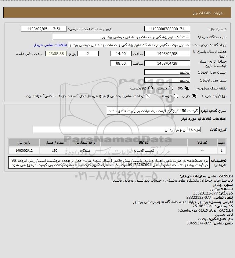 شرح کلی نیاز: گوشت 150 کیلوگرم