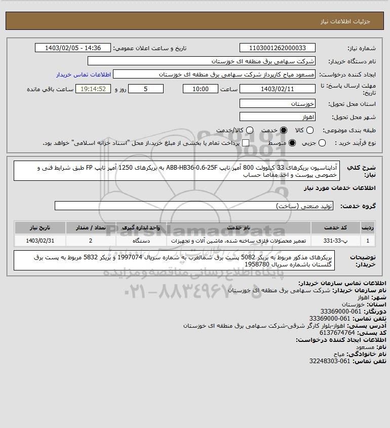 شرح کلی نیاز: آداپتاسیون بریکرهای 33 کیلوولت 800 آمپر تایپ ABB-HB36-0.6-25F به بریکرهای 1250 آمپر تایپ FP طبق شرایط فنی و خصوصی پیوست و اخذ مفاصا حساب
