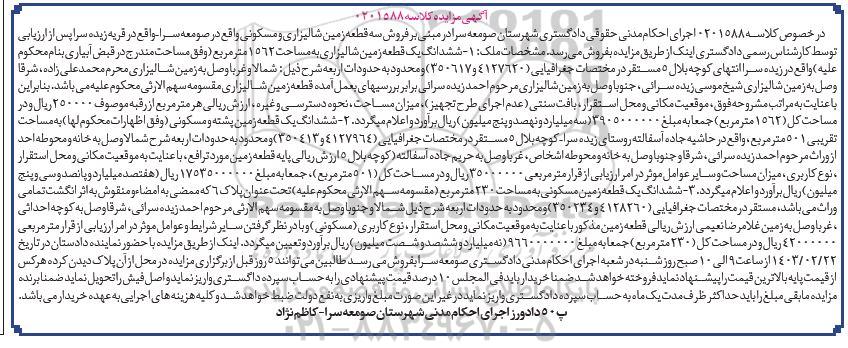 مزایده فروش یک قطعه زمین شالیزاری به مساحت 1562 مترمربع به مبلغ 3905000000 ریال و یک قطعه زمین پشته و مسکونی به مساحت 501 مترمربع 17535000000 ریال