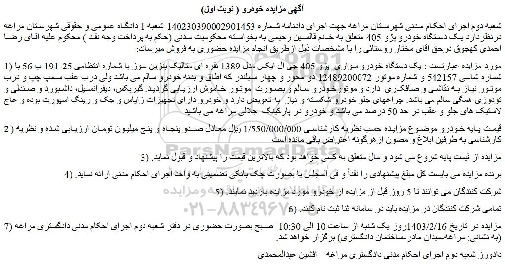 شعبه دوم اجرای احکام مدنی شهرستان مراغه جهت اجرای دادنامه شماره 140230390002901453 شعبه 1 دادگاه عمومی و حقوقی شهرستان مراغه درنظردارد یک دستگاه خودرو پژو 405 متعلق به خانم قالسین رحیمی به بخواسته محکومیت مدنی (حکم به پرداخت وجه نقد ) محکوم علیه آقای رضا احمدی کهجوق درحق آقای مختار روستائی را با مشخصات ذیل ازطریق انجام مزایده حضوری به فروش میرساند: