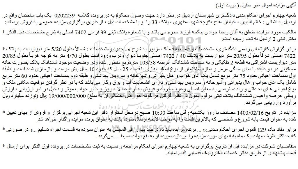شعبه چهارم اجرای احکام مدنی دادگستری شهرستان اردبیل در نظر دارد جهت وصول محکومٌ به در پرونده کلاسه  0202239  یک باب ساختمان واقع در اردبیل به نشانی : خاتم النبیین ، خیابان مفتح ،کوچه شهید مطهری ، پلاک 33 را  و با مشخصات ذیل ، از طریق برگزاری مزایده عمومی به فروش برساند: