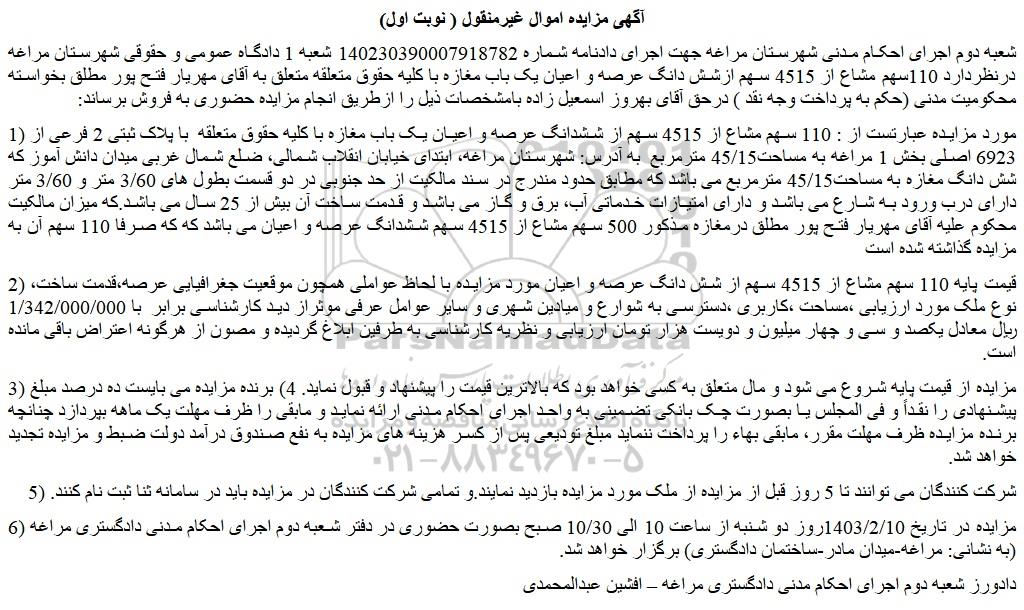 شعبه دوم اجرای احکام مدنی شهرستان مراغه جهت اجرای دادنامه شماره 140230390007918782 شعبه 1 دادگاه عمومی و حقوقی شهرستان مراغه درنظردارد 110سهم مشاع از 4515 سهم ازشش دانگ عرصه و اعیان یک باب مغازه با کلیه حقوق متعلقه متعلق به آقای مهریار فتح پور مطلق بخواسته محکومیت مدنی (حکم به پرداخت وجه نقد ) درحق آقای بهروز اسمعیل زاده بامشخصات ذیل را ازطریق انجام مزایده حضوری به فروش برساند: