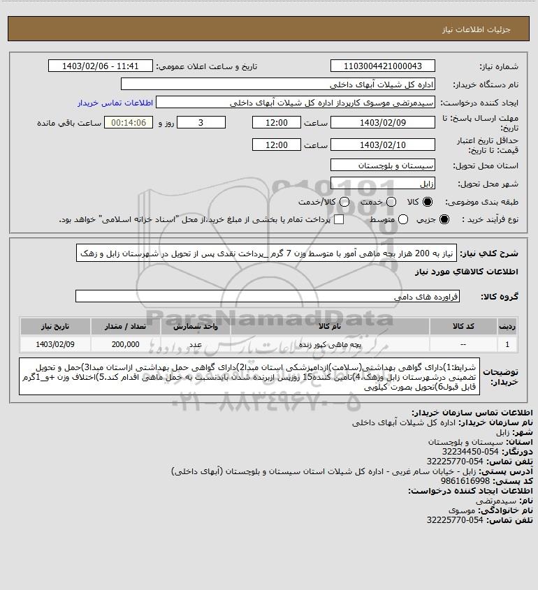 شرح کلی نیاز: نیاز به 200 هزار بچه ماهی آمور با متوسط وزن 7 گرم _پرداخت نقدی پس از تحویل در شهرستان زابل و زهک
