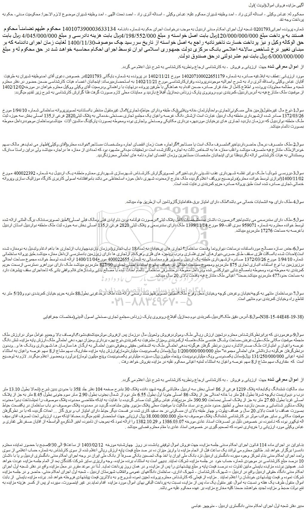 شماره پرونده اجرایی0201793 شعبه اول اجرای احکام مدنی اردبیل به موجب درخواست اجرای حکم به شماره دادنامه 140107390003633134 محکوم علیهم تضامناً محکوم هستند به پرداخت مبلغ 120/000/000/000ریال بابت اصل خواسته و مبلغ 4/198/552/000ریال بابت هزینه دادرسی و مبلغ 4/045/000/000 ریال بابت حق الوکاله وکیل و نیز پرداخت خسارت تاخیرتادیه راجع به اصل خواسته از تاریخ سررسید چک موصوف1400/11/30 لغایت زمان اجرای دادنامه که بر مبنای تغییر نرخ شاخص سالانه اعلامی بانک مرکزی دولت جمهوری اسلامی ایران توسط اجرای احکام محاسبه خواهد شد در حق محکوم له و مبلغ 6/000/000/000 ریال بابت نیم عشردولتی درحق صندوق دولت.