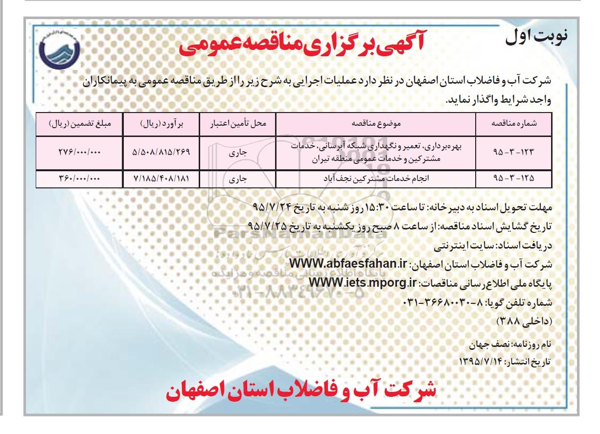 شرکت آب و فاضلاب استان اصفهان در نظر دارد عملیات اجرایی به شرح زیر را از طریق مناقصه عمومی به پیمانکاران واجد شرایط واگذار نماید.