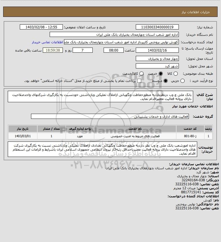 نام دستگاه خریدار:اداره امور شعب استان چهارمحال بختیاری بانک ملی ایران