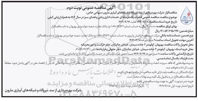 موضوع مناقصه: مناقصه عمومی فشرده یک مرحله ای خدمات اداری و فنی و فضای سبز در سال 1403 به همراه ارزیابی کیفی