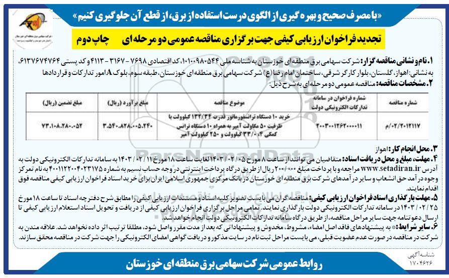 مناقصه خرید 10 دستگاه ترانسفورماتور قدرت 132.34 کیلوولت با ظرفیت 50 مگاولت- چاپ دوم از کلیه افراد متخصص و شرکتها واجد شرایط دعوت به عمل میآید در مناقصه با کد خبرگزاری پارس نماد: 7345014 شرکت نمایند.
