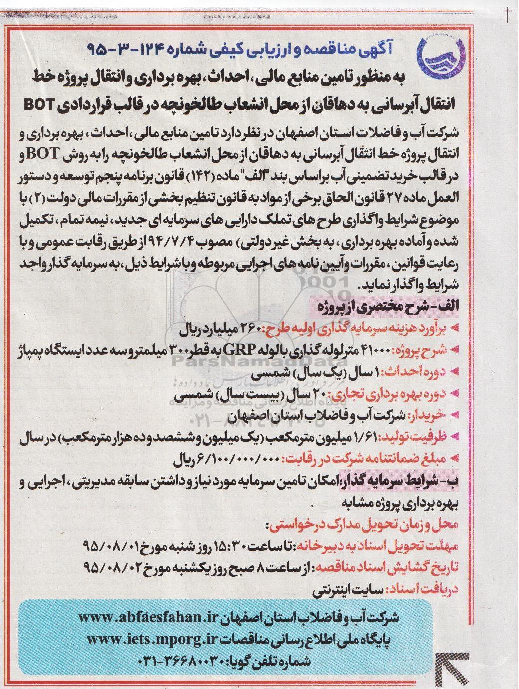 شرکت آب و فاضلاب استان اصفهان در نظر دارد تامین منابع مالی، احداث، بهره برداری و انتقال پروژه خط انتقال پروژه خط آبرسانی به دهاقان از محل انشعابات طالخونچه را به روش BOT و در قالب خرید تضمینی آب بر اساس بند الف ماده 142 قانون برنامه پنجم توسعه ا و دستوالعمل 27 قانونی الحاق برخی از مواد به قانون تنظیم بخشی از مقررات مالی دولت 2 با موضوع شرایط واگذاری طرحهای تملک دارایی های سرمایه ای جدید , نیمه تمام , تکمیل شده و آماده بهره برداری به بخش غیر دولتی مصو 94.7.4 از طریق رقابت عمومی و با رعایت قوانین، مقررات و آیین نامه های اجرایی مربوطه با شرایط ذیل به سرمایه گذار واجد شرایط واگذار نماید.