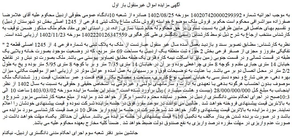 به موجب اجرائیه شماره 140207420000299392 مورخه 1402/08/25 صادره از شعبه 10دادگاه عمومی حقوقی اردبیل محکوم علیه آقای غلامرضا صفرزاده میراشرافی محکوم است حکم بر فروش ملک موضوع خواسته (فروش ملک مشاع پلاک ثبتی 4 فرعی از 1245 اصلی بخش دو شهرستان اردبیل) و تقسیم بهای حاصل فی مابین طرفین به نسبت تساوی در حق محکوم له خانم شیدا نمازی زاده، در راستای اجری مفاد حکم ملک مذکور ضمن توقیف به کارشناس منتخب ارجاع به شرح ذیل توسط کارشناس رسمی دادگستری طی کدرهگیری 1402220126347559 مورخه 1402/11/23 ارزیابی شده است.