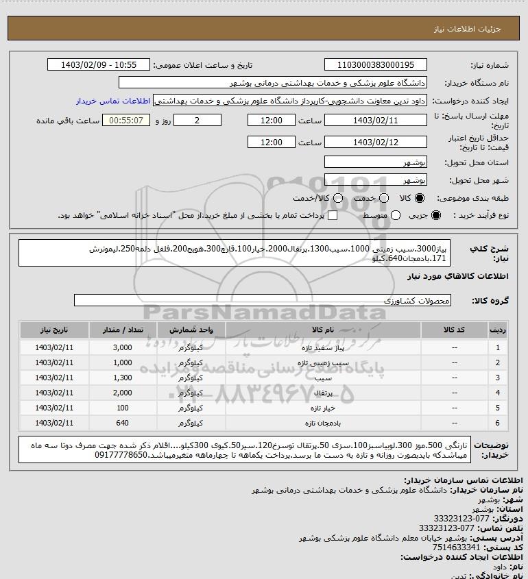 | 2 | -- | سیب زمینی تازه | کیلوگرم | 1,000 | 1403/02/11 |