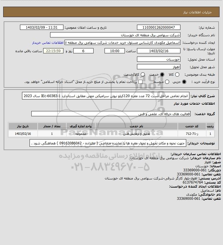 شرح کلی نیاز: انجام تمامی مراحل تست 72 عدد مقره  120کیلو نیوتن سرامیکی مهی
