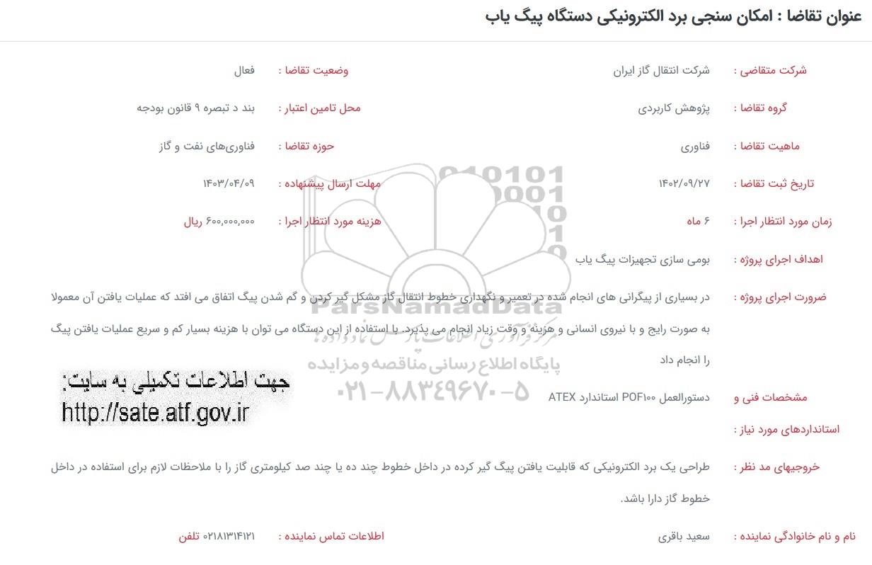 فراخوان امکان سنجی برد الکترونیکی دستگاه پیگ یاب از کلیه افراد متخصص و شرکتها واجد شرایط دعوت به عمل میآید در مناقصه با کد خبرگزاری پارس نماد: 7349847 شرکت نمایند.