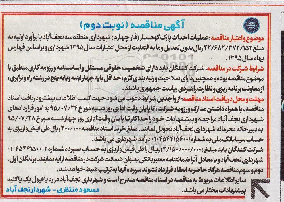 موضوع و اعتبار مناقصه : عملیات احداث پارک کوهسار (فاز چهارم) شهرداری منطقه سه نجف آباد با برآورد اولیه به مبلغ 42.682.372.152 ریال بدون تعدیل و مابه التفاوت از محل اعتبارات سال 95 شهرداری براساس فهارس بهاء سال 95