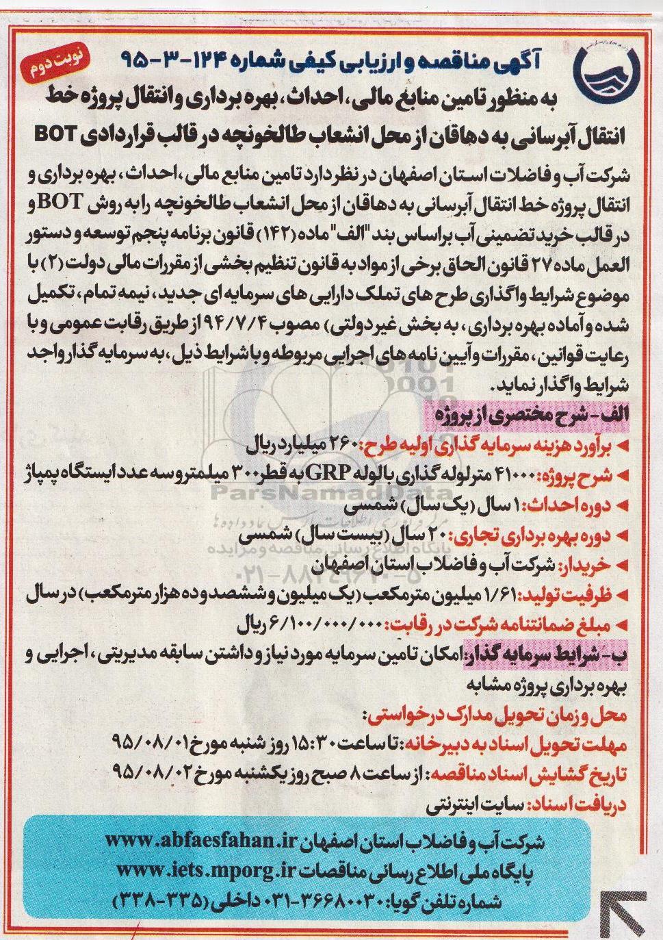 شرکت آب و فاضلاب استان اصفهان در نظر دارد تامین منابع مالی، احداث، بهره برداری و انتقال پروژه  خط انتقال پروژه خط آبرسانی به دهاقان از محل انشعابات طالخونچه را به روش BOT و در قالب خرید تضمینی آب بر اساس بند الف ماده 142 قانون برنامه پنجم توسعه ا و دستوالعمل 27 قانونی الحاق برخی از مواد به قانون تنظیم بخشی از مقررات مالی دولت 2 با موضوع شرایط واگذاری طرحهای تملک دارایی های سرمایه ای جدید , نیمه تمام , تکمیل شده و آماده بهره برداری به بخش غیر دولتی مصو 94.7.4 از طریق رقابت عمومی و با رعایت قوانین، مقررات و آیین نامه های اجرایی مربوطه با شرایط ذیل به سرمایه گذار واجد شرایط واگذار نماید.