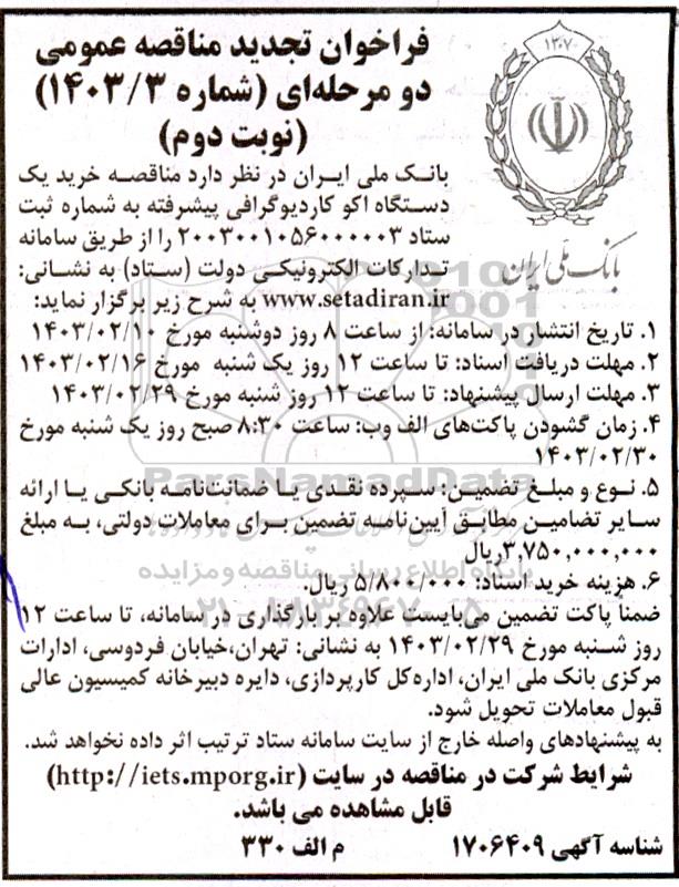 بانک ملی ایران در نظر دارد مناقصه خرید یک دستگاه اکو کاردیوگرافی پیشرفته به شماره ثبت ستاد 2003001056000003 را از طریق سامانه تدارکات الکترونیکی دولت (ستاد) به نشانی ستادایران به شرح زیر برگزار نماید